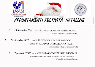 Arriva il natale, e il CSI “Porta del domani” di Montepaone Lido propone come ogni anno tante iniziative per grandi e piccini. Il 19 dicembre 2011 alle ore 17.30, infatti si terrà l’inaugurazione dei presepi rionali. Questa manifestazione è arrivata già alla sua seconda edizione grazie all’entusiasmo di tutte le persone che dallo scorso anno si sono riuniti in 4 rioni e con duro lavoro e impegno hanno dato vita ad altrettanti presepi che potranno essere visitati ogni giorno da tutta la cittadinanza, durante il periodo e gli orari che verranno indicati successivamente; infatti sarà affisso presso la piazza comunale un percorso che faciliterà la visita ai presepi. Il raduno è alle ore 17.30 presso il piazzale della Parrocchia San Giovanni Battista, per poi spostarsi insieme nelle diverse sedi dei presepi. Ma non finisce qui. La serata del 22 dicembre sarà dedicata interamente ai bambini. Si terrà, infatti alle ore 18.00 presso la sala consigliare, sita in piazza san Francesco di Paola, una tombolata per i più piccini con tanti premi e sorprese. Aspetteremo insieme l’arrivo di Babbo natale che alle 19.00 porterà tanti doni ai bambini presenti alla serata, che avranno l’onore di essere fotografati con lui!!! L’Ultima serata di festeggiamenti si terrà il 2 Gennaio 2012 alle 18.30 presso la Parrocchia San Giovanni Battista , dove si terrà la premiazione dei presepi rionali. La serata verrà allietata dall’orchestra parrocchiale “Laudato sii”, che come lo scorso rallegrerà la serate con gioiosi canti.